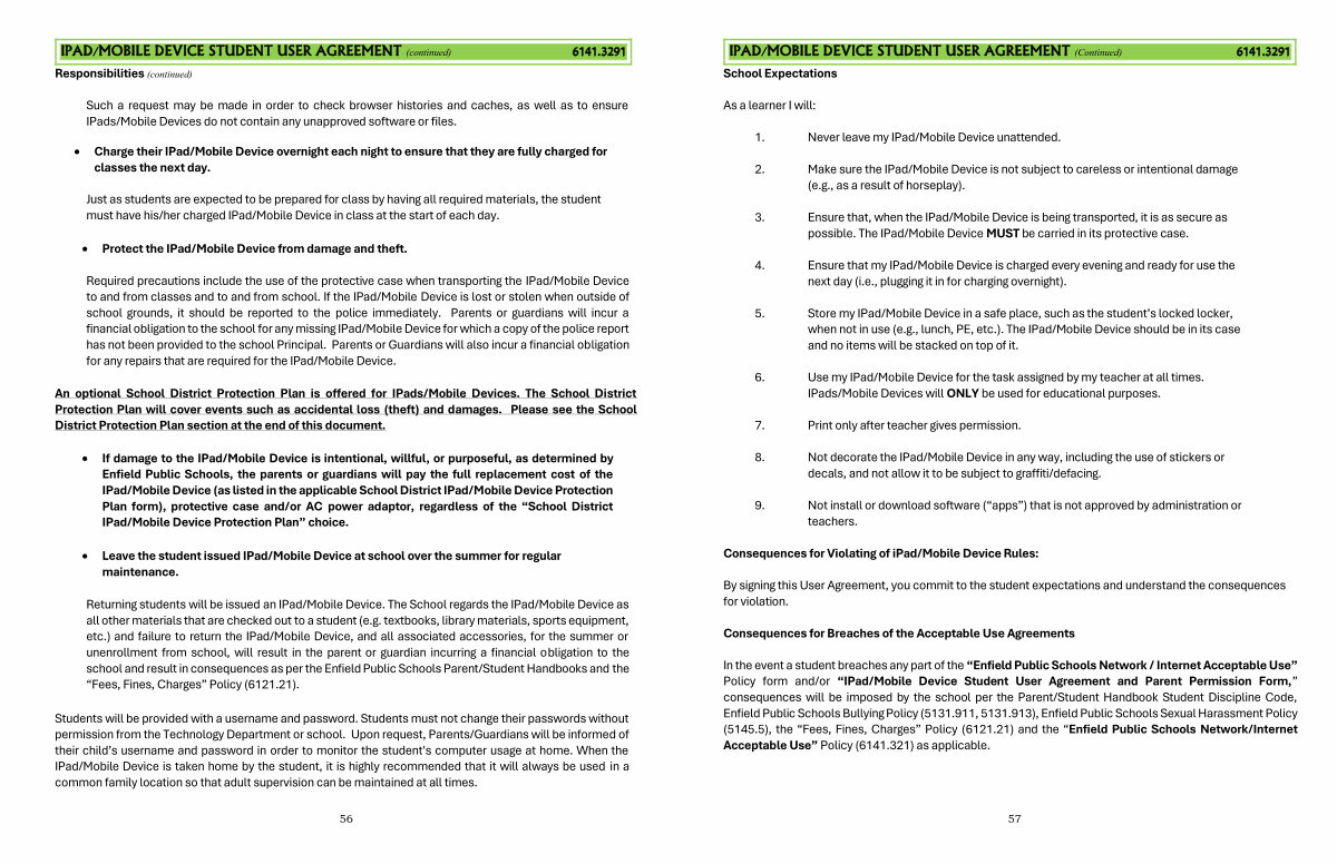 Returning students will be issued an IPad / Mobile Device. The School regards the IPad / Mobile Device as all other materials that are checked out to a student( e. g. textbooks, library materials, sports equipment, etc.) and failure to return the IPad / Mobile Device, and all associated accessories, for the summer or unenrollment from school, will result in the parent or guardian incurring a financial obligation to the school and result in consequences as per the Enfield Public Schools Parent / Student Handbooks and the“ Fees, Fines, Charges” Policy( 6121.21).