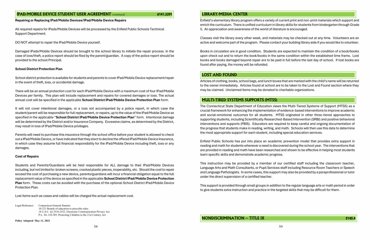 Damaged IPads / Mobile Devices should be brought to the school library to initiate the repair process. In the case of loss / theft, a police report should be filed by the parent / guardian. A copy of the police report should be provided to the school Principal.