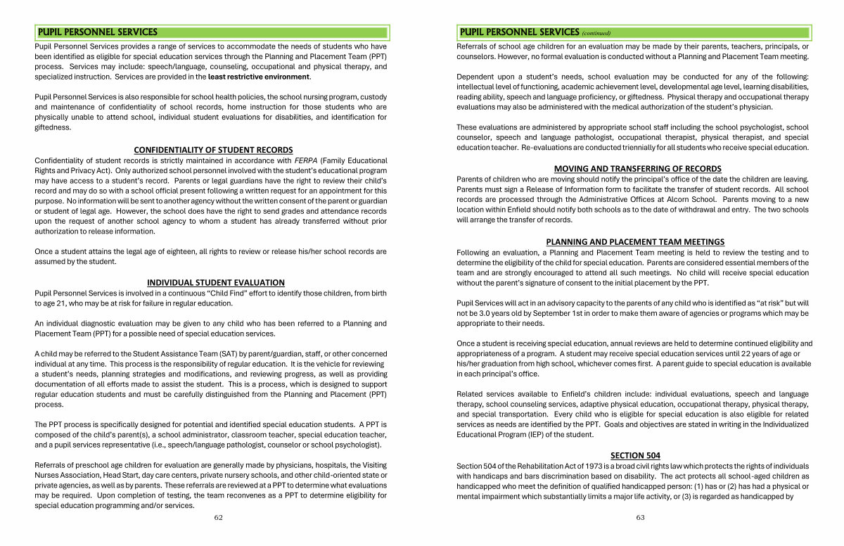 Once a student is receiving special education, annual reviews are held to determine continued eligibility and appropriateness of a program. A student may receive special education services until 22 years of age or his / her graduation from high school, whichever comes first. A parent guide to special education is available in each principal’ s office.