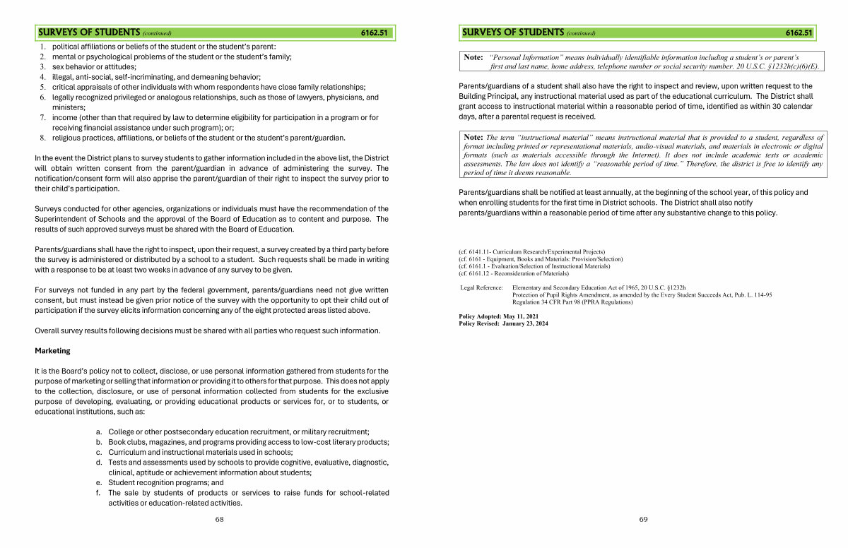 In the event the District plans to survey students to gather information included in the above list, the District will obtain written consent from the parent / guardian in advance of administering the survey. The notification / consent form will also apprise the parent / guardian of their right to inspect the survey prior to their child’ s participation.