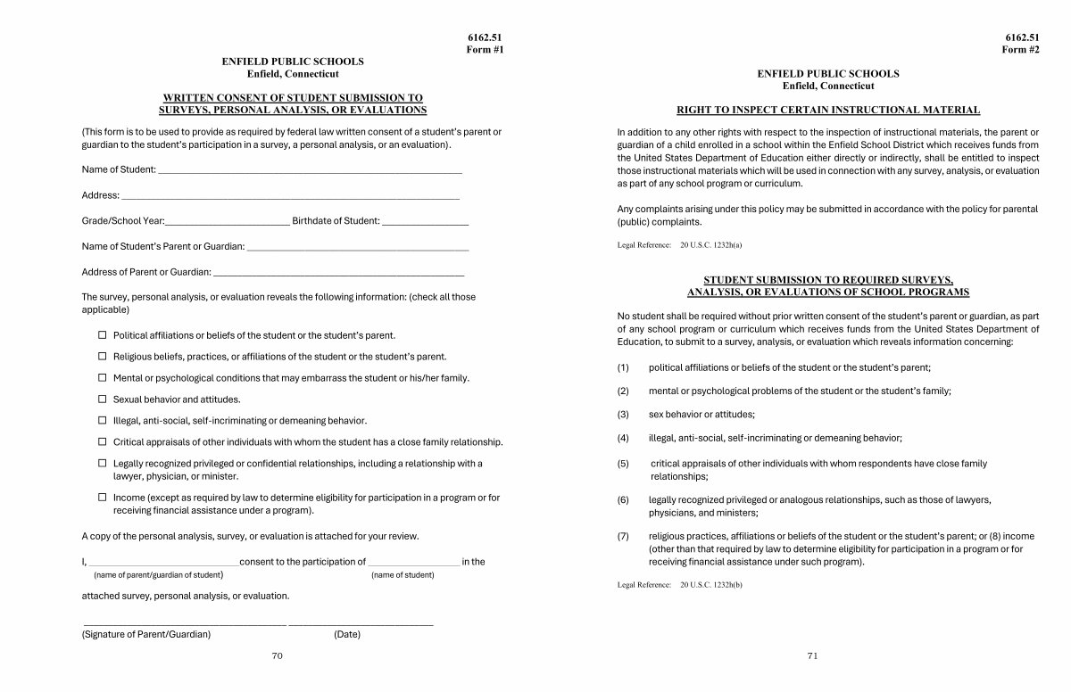 ( This form is to be used to provide as required by federal law written consent of a student’ s parent or guardian to the student’ s participation in a survey, a personal analysis, or an evaluation).