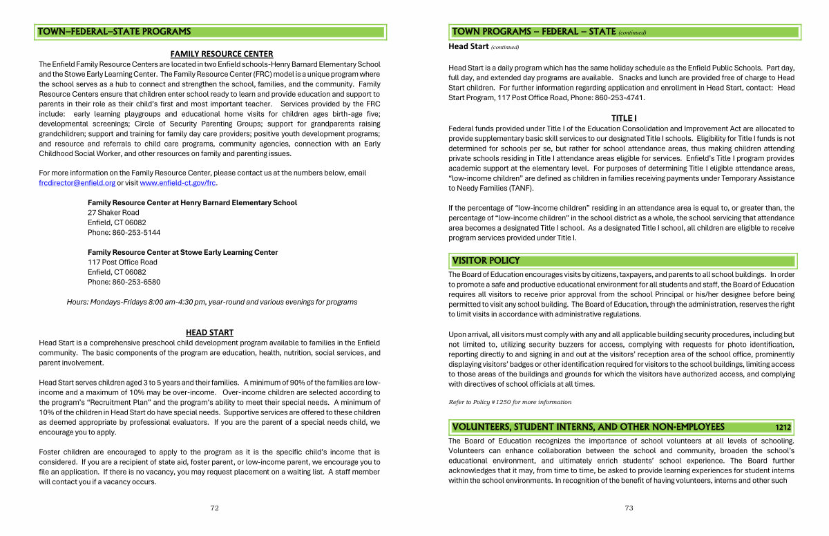 TITLE I Federal funds provided under Title I of the Education Consolidation and Improvement Act are allocated to provide supplementary basic skill services to our designated Title I schools. Eligibility for Title I funds is not determined for schools per se, but rather for school attendance areas, thus making children attending private schools residing in Title I attendance areas eligible for services. Enfield’ s Title I program provides academic support at the elementary level. For purposes of determining Title I eligible attendance areas,“ low-income children” are defined as children in families receiving payments under Temporary Assistance to Needy Families( TANF).