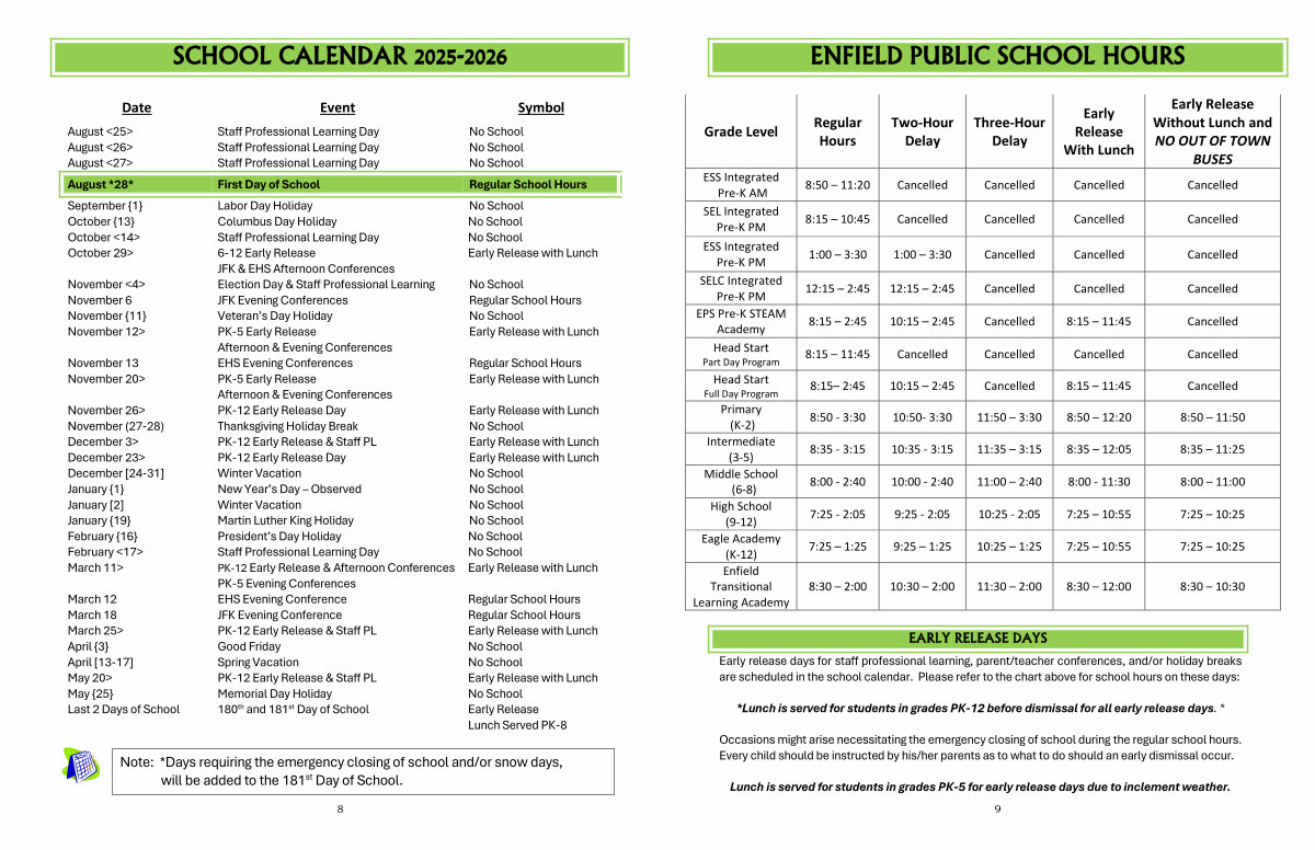 Early release days for staff professional learning, parent / teacher conferences, and / or holiday breaks are scheduled in the school calendar. Please refer to the chart above for school hours on these days: