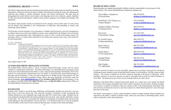 Legal Reference : Connecticut General Statutes 10-184 Duties of parents . ( as amended by PA 98-243 , PA 00-157 and PA 18-15 ) 10-198a Policies and procedures concerning truants ( as amended by PA 00-157 , PA 11-136 and PA 16-147 ) 10-198b State Board of Education to define “ excused absence ”, “ unexcused absence ”, and “ disciplinary absences ” 10-198c Attendance review teams ( as amended by PA 17-14 ) 10-198d Chronic absenteeism ( as amended by PA 18-182 ) 10-198e Identification of truancy identification models ( as amended by PA 18-182 ) 10-199 through 10-202 Attendance , truancy in general . ( Revised , 1995 , PA 95- 304 ) 45a-8c Truancy clinic . Administration . Policies and procedures . Report . ( as amended by PA 15-225 ) 10-220 ( c ) Duties of boards of education ( as amended by PA 15-225 ) 10-202e-f Policy on dropout prevention and grant program . 10-221 ( b ) Board of education to prescribe rules . Campbell v New Milford , 193 Conn 93 ( 1984 ). Action taken by the State Board of Education on January 2 , 2008 , to define “ attendance .” Action taken by the State Board of Education on June 27 , 2012 , to define “ excused and “ unexcused ” absences .