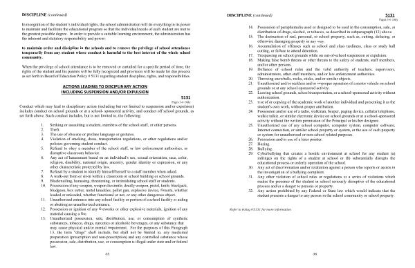 16 . Accumulation of offenses such as school and class tardiness , class or study hall cutting , or failure to attend detention . 17 . Trespassing on school grounds while on out-of-school suspension or expulsion . 18 . Making false bomb threats or other threats to the safety of students , staff members , and / or other persons . 19 . Defiance of school rules and the valid authority of teachers , supervisors , administrators , other staff members , and / or law enforcement authorities . 20 . Throwing snowballs , rocks , sticks , and / or similar objects . 21 . Unauthorized and / or reckless and / or improper operation of a motor vehicle on school grounds or at any school-sponsored activity . 22 . Leaving school grounds , school transportation , or a school-sponsored activity without authorization . 23 . Use of or copying of the academic work of another individual and presenting it as the student ' s own work , without proper attribution .
