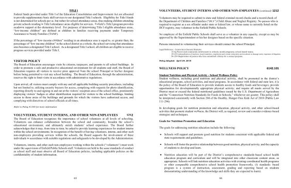 Student Nutrition and Physical Activity - School Wellness Policy Student wellness , including good nutrition and physical activity , shall be promoted in the district ’ s educational program , school activities , and meal programs . In accordance with federal and state law , it is the policy of the Board of Education to provide students access to healthy foods and beverages ; provide opportunities for developmentally appropriate physical activity ; and require all meals served by the District meet or exceed the federal nutritional guidelines issued by the U . S . Department of Agriculture and the “ Connecticut Nutrition Standards for Foods in Schools ,” whichever are greater . This policy shall be interpreted consistently with Section 204 of the Healthy , Hunger-Free Kids Act of 2010 ( Public Law 111-296 )