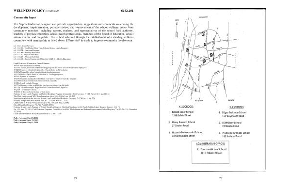 Legal Reference : Connecticut General Statutes 10-16b Prescribed courses of study . 10-215 Lunches , breakfasts and the feeding programs for public school children and employees . 10-221 Boards of education to prescribe rules , policies and procedures . 10-215a Non-public school participation in feeding program . 10-215b Duties of state board of education re : feeding programs . , 10-216 Payment of expenses . 10-215e Nutrition standards for food that is not part of lunch or breakfast program . 10-215f Certification that food meets nutrition standards . 10-221o Lunch periods . Recess . 10-221p Boards to make available for purchase nutritious , low-fat foods . 10-221q Sale of beverages . Regulations of Connecticut State Agencies 10-215b-1 Competitive foods . 10-215b-23 Income from the sale of food items . National School Lunch Program and School Breakfast Program ; Competitive Food Services . ( 7 CFR Parts 210.11 and 220.12 ) The Child Nutrition and WIC Reauthorization Act of 2004 , Public Law 108-265 Nutrition Standards in the National School Lunch and School Breakfast Programs , 7 CFR Parts 210 & 220 Healthy , Hunger-Free Kids Act of 2010 , P . L . 111-296 , 42 U . S . C . 1751 Child Nutrition Act of 1966 ( as amended by P . L . 108-269 , July 2 , 2004 ) School Breakfast Program , 7 C . F . R . Part 220 ( 2006 ) National School Lunch Program or School Breakfast Program : Nutrition Standards for All Foods Sold in School ( Federal Register , Vol . 78 , No . 125 , June 28 , 2013 ) Child Nutrition Programs : Flexibilities for Milk , Whole Grains and Sodium Requirements ( Federal Register , Vol . 83 , No . 238 , December 12 , 2018 ) Local School Wellness Policy Requirements , 42 U . S . C . 1758b