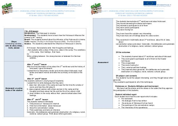 7 th, 8 th lesson Introduction: The Holocaust in cinema Development: The students have to learn how the Holocaust influence the cinema of 20 th century Result: The students learned about the influence of the Holocaust in cinema. Tools: movies( The Boy in the Striped Pajamas( 2008), The Pianist( 2002) Assess: The students understand the influence of Holocaust in cinema.