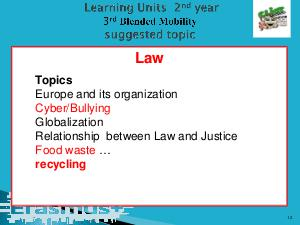 Law Topics Europe and its organization Cyber/Bullying Globalization Relationship between Law and Justice Food waste … recycling 12