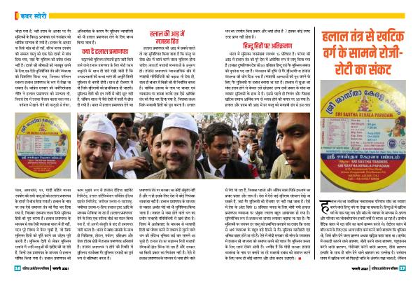 से रंगा जा रहा है , जिसका पहला और अंतिम लक्य सिर्फ इसिाम का प्रचार-प्रसार और लाभ है । देश में ऐसे कई मुससिम संसथान देखे जा सकते हैं , जहां गैर मुससिमों को रोजगार पर नहीं रखा जाता है । ऐसे में देश के अंदर सिर्फ 15 प्रतिशत जनता के लिए थोपी गयी हलाल प्रमाणपत् वयवसथा पर अंकुश लगाना बहुत आवशयक हो गया है । सुनियोजित रूप से हलाल का दायरा लगातार बढ़ाया जा रहा है । गैर मुससिमों पर लगभग हर वसिु को प्रमाणित करवाने का दबाव कि वजह से अर्थ वयवसथा के बहुत बड़े हिससे से गैर-मुससिम कारोबारी एवं श्तमक बाहर होते जा रहे हैं । ऐसे में मोदी सरकार की मांस के वयवसाय में हलाल की बाधयिा को समापि करने की पहल गैर मुससिम जनता के लिए राहत लेकर आयी है । उममीद है कि मोदी सरकार हलाल वयवसथा के नाम पर बनाये जा रहे मजहबी दबाव को समापि करने के लिए ि्द ही कोई कारगर और ठोस कदम उठाएगी । �