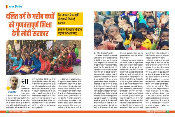 रही मकोदी सरकार ने दलित वर्ग के बच्ों कको अशिक्ा के जाल से मुकत करने के लिए एक बड़ा निर्णय लिया है । मकोदी सरकार के निर्णय का लाभ आर्थिक तंगी की वजह से शिक्ा से ददूर हको जाने वाले दलित वर्ग के बच्ों कको मिलेगा । दलित वर्ग यानी अनुसदूवचत जाति के गरीब बच्ों कको अब