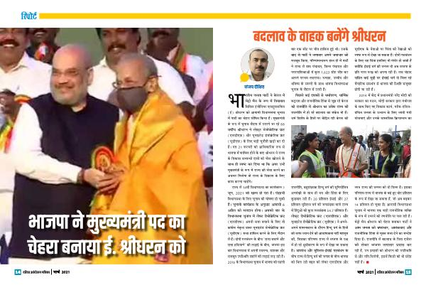 लाभ राजर की जनता को भी मिला है । इसका परिणाम राजर में भाजपा के बढे हुए वोटि प्रतिशत के रूप में देखा जा सकता है , जो अब बढ़कर 14 प्रतिशत हो चिुका हैI आगामी विधानसभा चिुनाव में भाजपा एक बड़ी राजनीतिक शक्त के रूप में उभरने की रणनीति पर चिल रही है । मेट्ो मैन श्ीधरन को चिेहरा बनाकर पार्टी ने आम जनता को भ्रष्टाचार , आतंकवाद और राजनीतिक हिंसा से मु्त सत्ा देने का सनदेश दिया है । राजनीति में बदलाव के जिस एजेंडा को लेकर भाजपा लगातार प्रयास कर रही है , उन प्रयासों को श्ीधरन की उपशसथमत से और गति मिलेगी , इसमें किसी को भी संदेह नहीं है । �