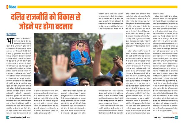 वर्तमान दलित राजनीति की जो कमियां , कमजोरियां , भटिकाव और उलझनें दृष्टिगोचिर हुयी हैं उनके परिपेक्र में एक नए विकलप की ज़रुरत है जो परमपरागत सत्ा की राजनीति की जगह वरिसथा परिवर्तन की पक्धर हो । वर्तमान दलित पामटि्डरां एक वरश्त आधारित पामटि्डरा हैं जो उनकी वरश्तगत जागीर हैं जिसका इसतेमाल एक वरापारिक घराने की तरह किया जाता है । इनके अधरक् ही इनके सिचेसर्वा हैं और उनके अलावा पार्टी में किसी दूसरे नेता का कोई अशसतति नहीं है । डलॉ . आंबेडकर द्ारा सथामपत पामटि्डरों की एक ख़ास विशेषता यह थी कि इनमें सामूहिक नेतृत्ि और अंदरूनी लोकतंत् का विशेष प्रावधान था । वरश्त पूजा के लिए कोई सथान नहीं था । बाबा साहब ने कहा था कि जातिविहीन एवं वर्गविहीन समाज की सथापना हमारा रा्ट्ीर लक्र है । उन का यह भी निश्चित मत था कि जाति उनमूलन किये बिना न केवल दलितों बशलक समपूण्य हिनदू समाज की मुक्त संभव नहीं है । . 1952 में शैड्ुलड कास्टस फेडेरशन के संविधान में राजनीतिक पार्टी की भूमिका की वराखरा करते हुए डलॉ . आंबेडकर ने कहा था , “ राजनैतिक पार्टी का काम केवल चिुनाव जीतना ही नहीं होता , बशलक यह लोगों को मशमक्त करने , उद्ेमलत करने और संगठित करने का होता है .” इसी प्रकार दलित नेता के गुणों का बखान करते हुए उनहोंने कहा था , “ आपके नेता का साहस और बुद्धिमत्ा किसी भी पार्टी के सिवोच्च नेता से कम नहीं होनी चिाहिए . दक् नेताओं के बिना पार्टी ख़तम हो जाती है ”। इसके विपरीत यह देखा गया है कि वर्तमान दलित पामटि्डराँ दलितों को मशमक्त करने , उद्ेमलत करने और संगठित करने की बजाये उनका इसतेमाल केवल जाति वोटि बैंक के रूप में करती हैं । इसी तरह वर्तमान दलित नेताओं का कद् और बुद्धिमत्ा डलॉ . आंबेडकर के मापदंडों से कोसों दूर हैं । अतः दलित पार्टी की राजनीतिक और सामाजिक भूमिका बहुत सप्टि होनी चिाहिए और उन के नेता सुयोगर होने चिाहिए ।