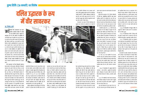 इस प्रकार के अनेक उदहारण वीर सावरकर जी के जीवन से हमें मिलते हैं , जिससे दलित उद्धार के विषय में उनके विचिारों को , उनके प्रयासों को हम जान पाते हैं । सावरकर जी के बहुआयामी जीवन के विमभन् पहलुओं में से सामाजिक सुधारक के रूप में वीर सावरकर को समरण करने का मूल उद्े्र दलित समाज को विशेष रूप से सनदेश देना है । जिसने राजनीतिक सिाथयों की पूर्ति के लिए सवर्ण समाज द्ारा अछूत जाति के लिए गए सुधार कारयों की अपेक्ा कर दी है । और उनहें केवल विरोध का पात् बना दिया हैं । वीर सावरकर महान क्रांतिकारी ्राम जी कृ्ण वर्मा जी के क्रांतिकारी विचिारों से लनदन में पढ़ते हुए संपर्क में आये थे । ्रामजी कृ्ण वर्मा सिामी दयानंद के मश्र थे । सिामी दयानंद के दलितों के उद्धार करने रूपी मचिंतन को हम सप्टि रूप से वीर सावरकर के मचिंतन में देखते हैं ।