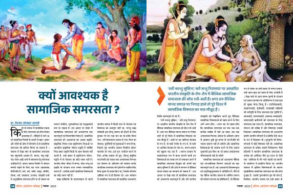 आवश्यक है । परीदढ्यों से चले आ रहे सामाजिक दन्यमों के दा्यरों से बाहर आकर और लोगों करी सोच में पररि्तमान से हरी सामाजिक समरस्ता को हासिल दक्या जा सक्ता है । वास्तव में देखा जाए ्तो सामाजिक समरस्ता एक बहुव्यापरी आ्याम है । मानव , पशु-पक्षी , जड़-चे्तन आदि सभरी में सामंजस्य हे्तु समरस्ता अपरिहा्यमा है । मानव समाज निर्माण में संगठन बना्ये रखने के लिए ्यह परम आवश्यक परिस्थिति है । वर्ण , वर्ग , जाद्त , समूह , सदमद्त , संसथा , धर्म , समप्रदा्य , सभ्य्ता , संस्कृति सभरी में अनुवांशिक समरस्ता होने पर हरी समाज का
