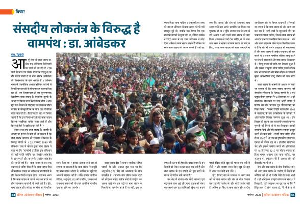 बाबा साहब के भाषणों के आधार पर कहा जा सक्ता है कि बाबा साहब वामपंथ को संसदरी्य लोक्तंत् के विरुद्ध मान्ते थे । संघ प्रमुख मोहन भागि्त ने 16 दिसमबर 2015 को समाजिक समरस्ता पर दिए अपने भाषण में दद््तरी्य सर संघ चालाक गुरु गोलवलकर का जिक्र दक्या । जिसमें उनहोंने ब्ता्या कि 1942 में महाराष्ट्र के एक स्वयंसेवक के परिवार में अं्तरजा्तरी्य विवाह समपन्न हुआ था । इस विवाह करी सूचना जब ्ततकालरीन सरसंघचालक गुरूजरी को मिलरी ्तो वे पत् लिखकर इसकरी सराहना दक्ये और ऐसे उदाहरण लगा्तार प्रस्तु्त करने करी बा्त कहरी । इससे साफ़ जाहिर हो्ता है कि 1942 में भरी संघ का दृष्टिकोण सामाजिक एक्ता को लेकर दृढ था । हालांकि समाजिक भेद और इसको समाप्त करने करी अनिवा्यमा्ता पर 16 दिसमबर 2015 का मोहन भगि्त का दद्या भाषण अवश्य सुना जाना चाहिए , ्यह ्यूट्ूब पर उपलबध भरी है अथवा संघ करी वेबसाईट पर भरी है ।