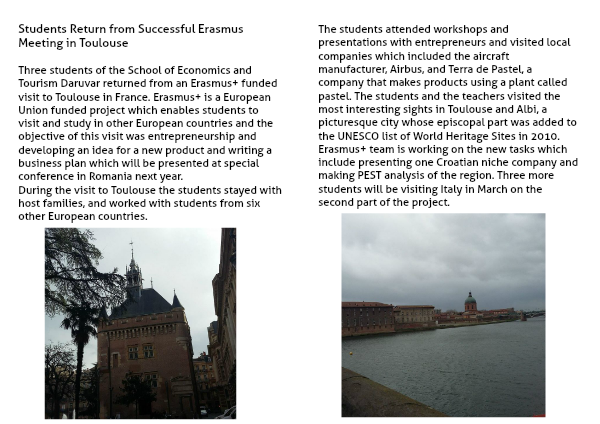 Three students of the School of Economics and Tourism Daruvar returned from an Erasmus+ funded visit to Toulouse in France. Erasmus+ is a European Union funded project which enables students to visit and study in other European countries and the objective of this visit was entrepreneurship and developing an idea for a new product and writing a business plan which will be presented at special conference in Romania next year.