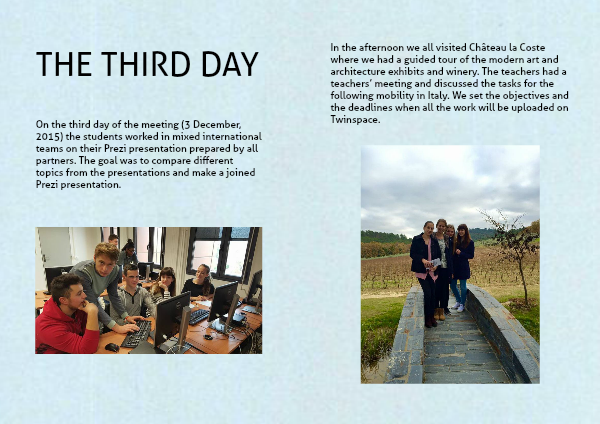 In the afternoon we all visited Château la Coste where we had a guided tour of the modern art and architecture exhibits and winery. The teachers had a teachers’ meeting and discussed the tasks for the following mobility in Italy. We set the objectives and the deadlines when all the work will be uploaded on Twinspace.