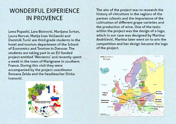 The aim of the project was to research the history of viticulture in the regions of the partner schools and the importance of the cultivation of different grape varieties and the production of wine. One of the tasks within the project was the design of a logo, which in our case was designed by Martina Andričević. Martina later went on to win the competition and her design became the logo of the project.
