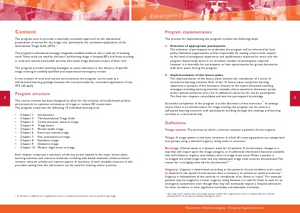 The program provides teaching strategies to assist educators in the delivery of specific triage training to suitably qualified and experienced emergency nurses.