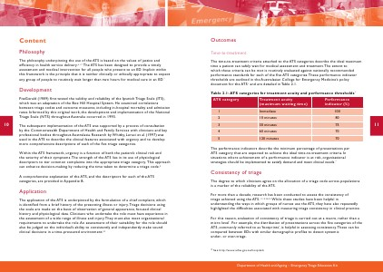 The subsequent implementation of the ATS was supported by a process of consultation by the Commonwealth Department of Health and Family Services with clinicians and key professional bodies throughout Australasia. Research by Whitby, Leraci et al.( 1997) was used in the ATS to describe the clinical features associated with urgency and to develop more comprehensive descriptions of each of the five triage categories.