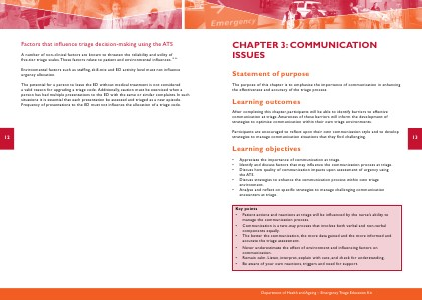 After completing this chapter, participants will be able to identify barriers to effective communication at triage. Awareness of these barriers will inform the development of strategies to optimise communication within their own triage environments.