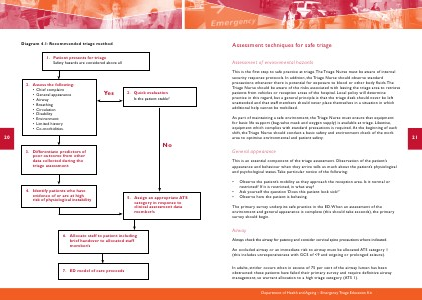 This is the first step to safe practice at triage. The Triage Nurse must be aware of internal security response protocols. In addition, the Triage Nurse should observe standard precautions whenever there is potential for exposure to blood or other body fluids. The Triage Nurse should be aware of the risks associated with leaving the triage area to retrieve patients from vehicles or reception areas of the hospital. Local policy will determine practice in this regard, but a general principle is that the triage desk should never be left unattended and that staff members should never place themselves in a situation in which additional help cannot be mobilised.