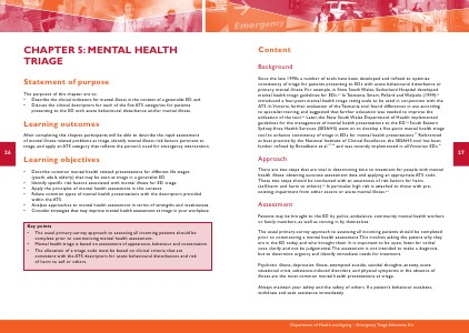 Since the late 1990s a number of tools have been developed and refined to optimise consistency of triage for patients presenting to EDs with acute behavioural disturbance or primary mental illness. For example, in New South Wales, Sutherland Hospital developed mental health triage guidelines for EDs. 42 In Tasmania, Smart, Pollard and Walpole( 1999) 43 introduced a four-point mental health triage rating scale to be used in conjunction with the ATS. In Victoria, further evaluation of the Tasmania tool found differences in use according to specialist training, and suggested that further education was needed to improve the utilisation of the tool. 35 Later, the New South Wales Department of Health implemented guidelines for the management of mental health presentations to the ED. 36 South Eastern Sydney Area Health Services( SESAHS) went on to develop a five-point mental health triage tool to enhance consistency of triage in EDs for mental health presentations. 37 Referenced as best practice by the National Institute of Clinical Excellence, the SESAHS tool has been further refined by Broadbent et al. 47-49 and was recently implemented in all Victorian EDs. 41