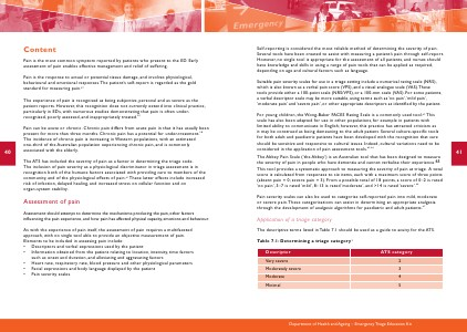 The Abbey Pain Scale(‘ the Abbey’) is an Australian tool that has been designed to measure the severity of pain in people who have dementia and cannot verbalise their experience. 65 This tool provides a systematic approach to measuring the severity of pain at triage. A total score is calculated from responses to six items, each with a maximum score of three points( absent pain = 0; severe pain = 3). From a possible total of 18 points, a score of 0 – 2 is rated‘ no pain’, 3 – 7 is rated‘ mild’, 8 – 13 is rated‘ moderate’, and > 14 is rated‘ severe’. 66