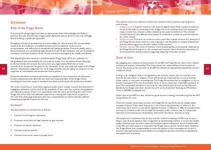 Emergency Nurses, as professionals, are accountable for their practice. The accountability comes from the utilisation of available protocols, the completion of the correct documentation, and adherence to standards and quality guidelines. Protocols ideally help in the maintenance of a consistently high standard of care at the institution and can be utilised if necessary to provide evidence of the clinical practice encouraged at the health care facility.