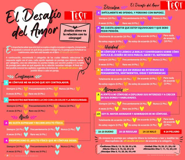 A continuación , encontrarás 5 categorías de las cuales deberás seleccionar la respuesta según sea el caso , cada opción equivale un puntaje que deberás sumar por categoría .; una vez obtenidos los puntos totales por sección podrás ir a la tabla de puntaje para saber en qué aspecto de su relación necesitan trabajar . Al final del test podrás conocer los capítulos sugeridos de lectura de « El desafío del amor » que podrán llevar a cabo en pareja .