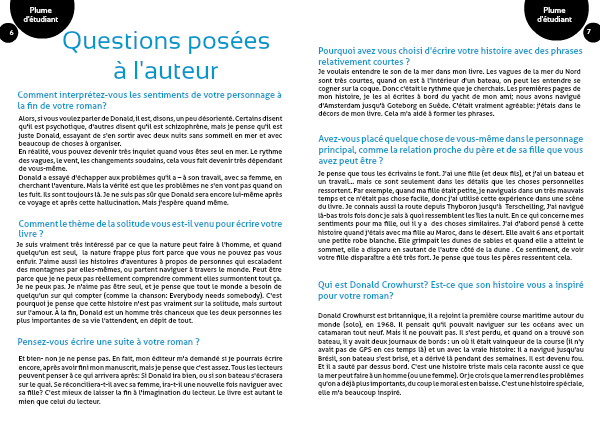 Et bien- non je ne pense pas. En fait, mon éditeur m'a demandé si je pourrais écrire encore, après avoir fini mon manuscrit, mais je pense que c'est assez. Tous les lecteurs peuvent penser à ce qui arrivera après : Si Donald ira bien, ou si son bateau s'écrasera sur le quai . Se réconciliera-t-il avec sa femme, ira-t-il une nouvelle fois naviguer avec sa fille ? C'est mieux de laisser la fin à l'imagination du lecteur. Le livre est autant le mien que celui du lecteur.