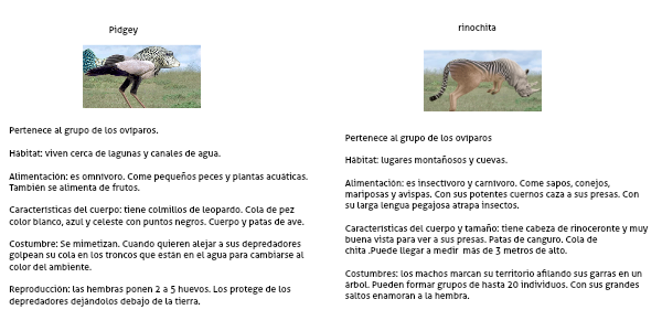 Características del cuerpo: tiene colmillos de leopardo. Cola de pez color blanco, azul y celeste con puntos negros. Cuerpo y patas de ave.