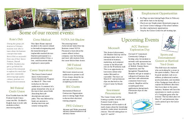 The Career Center hosted Junior Achievement’ s Career Inspirations Program on March 8 th. This event took place in the new auditorium. It consisted of a group of panelists who are at the top in their career fields discussing their job descriptions and career paths. This was followed by break out sessions to develop interview and resume writing skills.