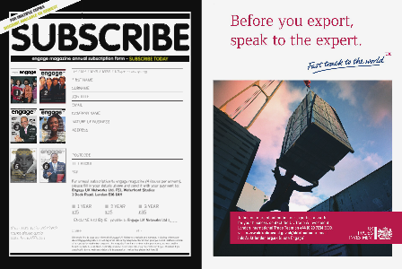 For annual subscription to engage magazine( 4 issues per annum), please fill in your details above and send it with your payment to: Engage UK Networks Ltd. F51, Waterfront Studios 1 Dock Road, London E16 1AH