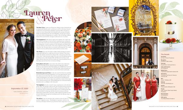 The Theme: Since the Providence Public Library already provided a stunning backdrop, the couple kept the decor minimal. They chose a fall color palette of terracotta orange with cream, green and a few other colors. Subtle literary-inspired accents tied everything together, including escort cards designed like old library borrowing cards, tables named after their favorite books and custom bookmark favors featuring a quote from their ceremony readings.