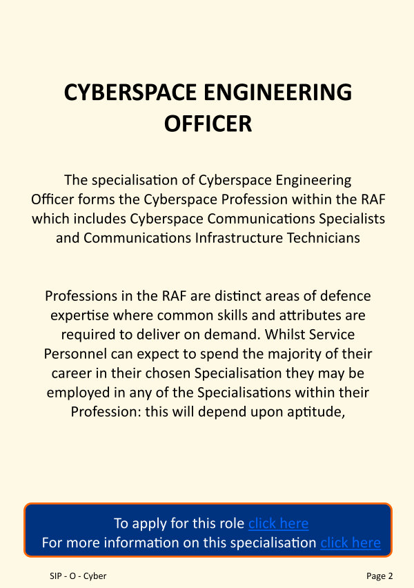 The specialisation of Cyberspace Engineering Officer forms the Cyberspace Profession within the RAF which includes Cyberspace Communications Specialists and Communications Infrastructure Technicians