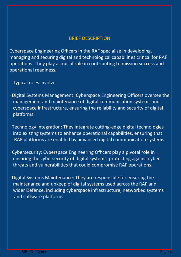 · Cybersecurity: Cyberspace Engineering Officers play a pivotal role in ensuring the cybersecurity of digital systems, protecting against cyber threats and vulnerabilities that could compromise RAF operations.