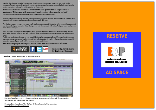 E+P: Any last minute words of advice for the next generation or engineers and producers? Things you wish you would have been told when you started out?