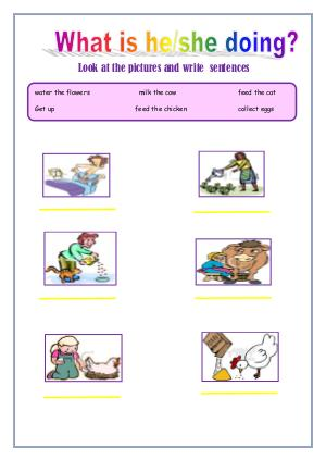 Look at the pictures and write sentences water the flowers Get up milk the cow feed the chicken feed the cat collect eggs