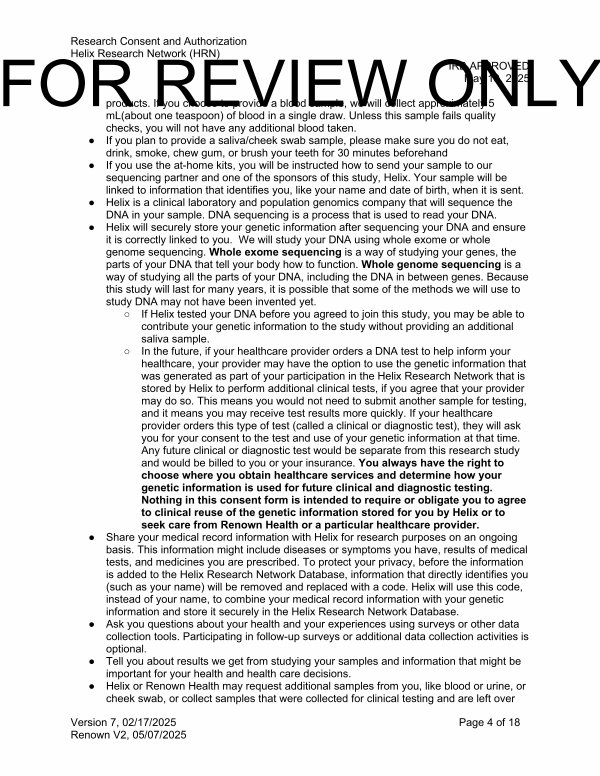○ In the future, if your healthcare provider orders a DNA test to help inform your healthcare, your provider may have the option to use the genetic information that was generated as part of your participation in the Helix Research Network that is stored by Helix to perform additional clinical tests, if you agree that your provider may do so. This means you would not need to submit another sample for testing, and it means you may receive test results more quickly. If your healthcare provider orders this type of test( called a clinical or diagnostic test), they will ask you for your consent to the test and use of your genetic information at that time. Any future clinical or diagnostic test would be separate from this research study and would be billed to you or your insurance. You always have the right to choose where you obtain healthcare services and determine how your genetic information is used for future clinical and diagnostic testing. Nothing in this consent form is intended to require or obligate you to agree to clinical reuse of the genetic information stored for you by Helix or to seek care from Renown Health or a particular healthcare provider.