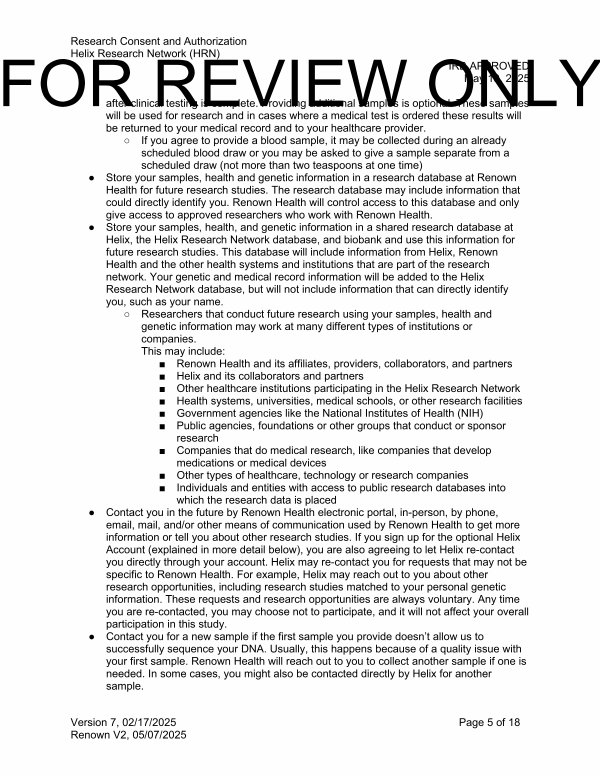 ● Contact you in the future by Renown Health electronic portal, in-person, by phone, email, mail, and / or other means of communication used by Renown Health to get more information or tell you about other research studies. If you sign up for the optional Helix Account( explained in more detail below), you are also agreeing to let Helix re-contact you directly through your account. Helix may re-contact you for requests that may not be specific to Renown Health. For example, Helix may reach out to you about other research opportunities, including research studies matched to your personal genetic information. These requests and research opportunities are always voluntary. Any time you are re-contacted, you may choose not to participate, and it will not affect your overall participation in this study.