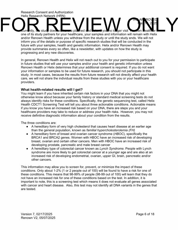 In general, Renown Health and Helix will not reach out to you for your permission to participate in future studies that will use your samples and / or your health and genetic information unless Renown Health or Helix determines that your additional consent is required. If you do not want your information or samples to be used for future research, you should not participate in this study. In most cases, because the results from future research will not directly affect your health care, we will not share the individual results from these studies with you or your healthcare providers.