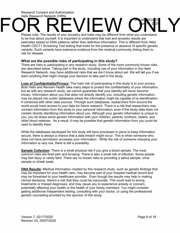 Loss of Confidentiality / Privacy: The main risk of participating in this study is to your privacy. Both Helix and Renown Health take many steps to protect the confidentiality of your information, but as with any research study, we cannot guarantee that your identity will never become known. Information about you that does not directly identify you, including genetic information, may be placed into public databases where the information might be capable of re-identification if combined with other data sources. Through such databases, researchers from around the world would have access to your data for future research. There is a risk that researchers may connect information from this study to your personal information, even if the study data does not contain directly identifying information about you. Although your genetic information is unique to you, you do share some genetic information with your children, parents, brothers, sisters, and other blood relatives. As a result, it may be possible that genetic information from you could be used to identify them.