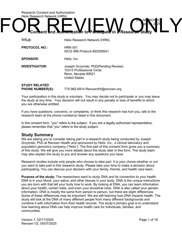 We are asking you to consider taking part in a research study being conducted by Joseph Grzymski, PhD at Renown Health and sponsored by Helix, Inc., a clinical laboratory and population genomics company(“ Helix”). The first part of this consent form gives you a summary of this study. We will give you more details about the study later in this form. The study team may also explain the study to you and answer any questions you have.