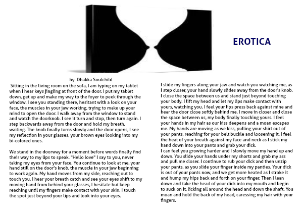 I slide my fingers along your jaw and watch you watching me, as I step closer, your hand slowly slides away from the door's knob. I close the space between us and stand just beyond touching your body. I lift my head and let my lips make contact with yours, watching you. I feel your lips press back against mine and hear the door close softly behind me. I move in closer and close the space between us, my body finally touching yours. I feel your hands in my hair as our kiss deepens and a moan escapes me. My hands are moving as we kiss, pulling your shirt out of your pants, reaching for your belt buckle and loosening it. I feel the heat of your breath against my face and neck as I stick my hand down into your pants and grab your dick.