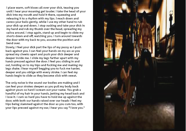 The only noise is the sound our bodies are making and I can feel your strokes deepen as you pull my body back against yours so hard I scream out your name. You grab a handful of my hair in your hands, jerking my head back and I lose it. I cum so hard you have to hold me up against the door, with both our hands raised over our heads I feel my hips being slammed against the door as you cum too, with your lips pressed against my ear, I hear you say "I love you."