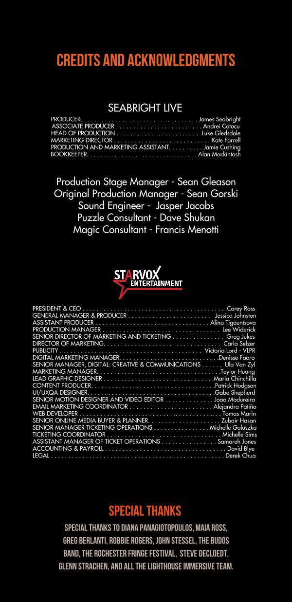 SPECIAL THANKS Special Thanks to Diana Panagiotopoulos, Maia Ross, Greg Berlanti, Robbie Rogers, John Stessel, The Budos Band, the Rochester Fringe Festival, Steve Decloedt, Glenn Strachen, and all the Lighthouse Immersive team.