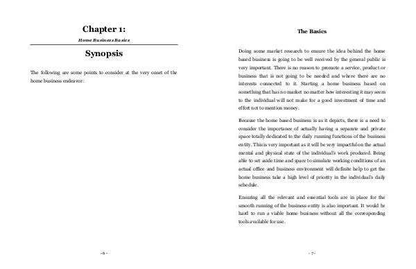 Chapter 1: Home Business Basics Synopsis The following are some points to consider at the very onset of the home business endeavor: - 6 -