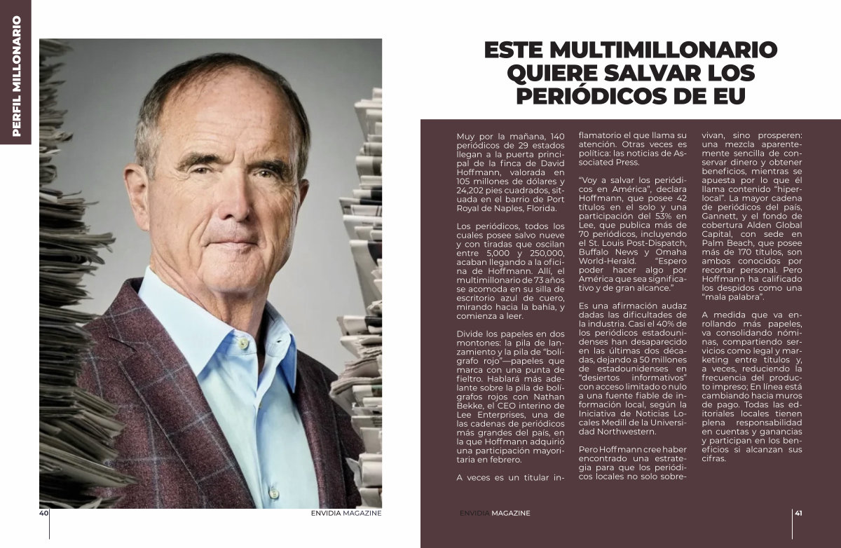 “ Voy a salvar los periódicos en América”, declara Hoffmann, que posee 42 títulos en el solo y una participación del 53 % en Lee, que publica más de 70 periódicos, incluyendo el St. Louis Post-Dispatch, Buffalo News y Omaha World-Herald.“ Espero poder hacer algo por América que sea significativo y de gran alcance.”